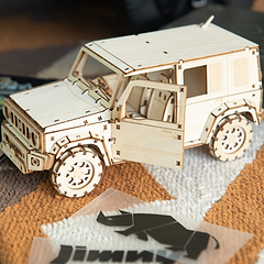 組立式木製フィギュア「Ki-gu-mi ジムニーノマド 」はハサミやカッター、のり、接着剤等の道具を一切使わずに組み上げられる立体パズルです。立体的なジムニーノマドを一枚の板から組み立てていく幸せな時間を是非ご堪能ください。